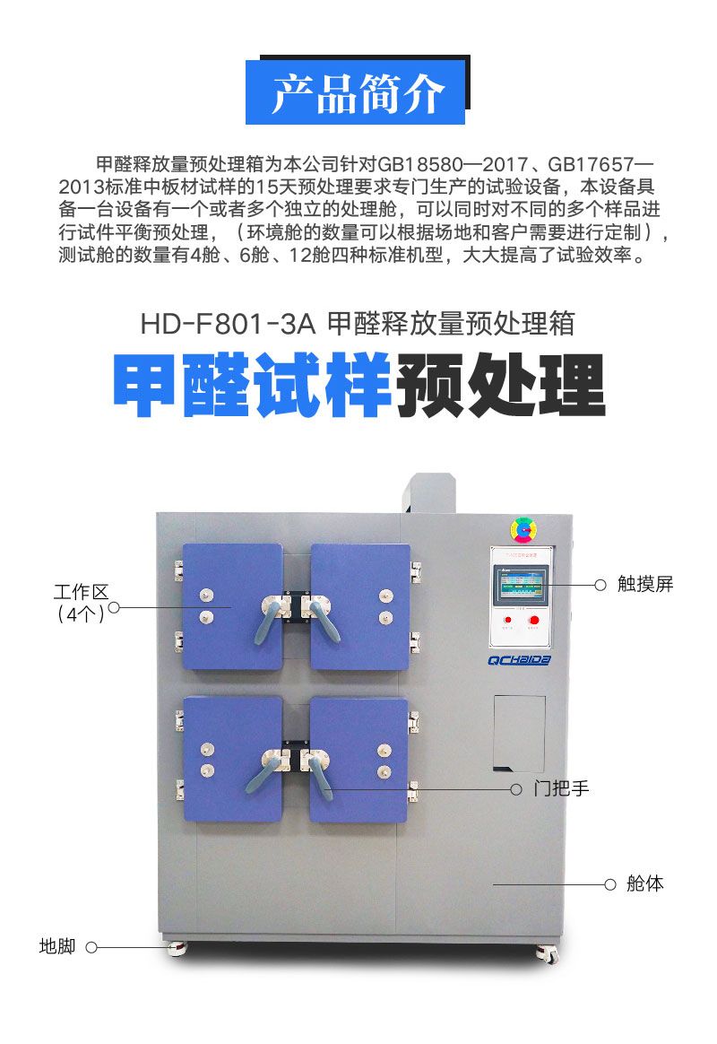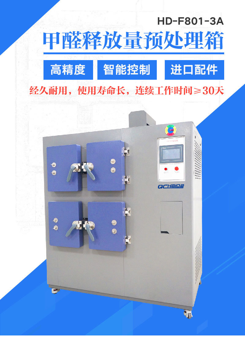 甲醛預處理箱是根據國標GB18580-2017和ASTMD6007-2、EN717-1、ANSI/BIFMAX7.1-2007開發的一套專門針對板材甲醛釋放量檢測前期預處理多艙箱體,其特點是可最大限度的模擬室內氣候環境,平衡處理試驗板材,使其達到釋放平衡,便于釋放量甲醛檢測試驗。