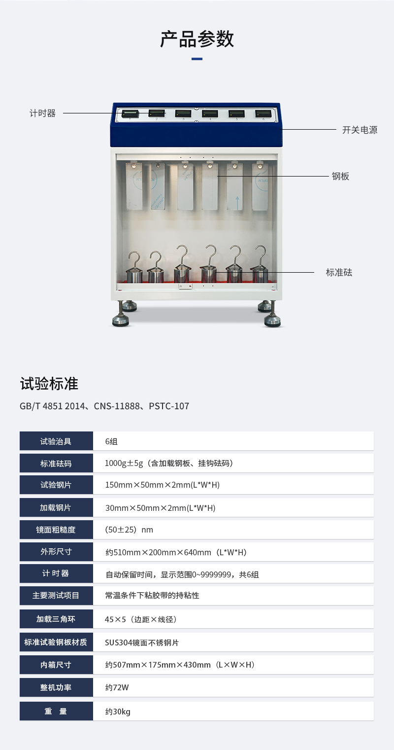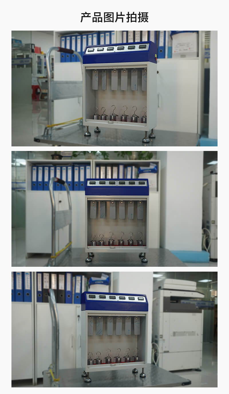 該儀器測試方法是將膠帶粘于測試鋼片上,下端懸掛標準荷重,經過一段時間后,測量膠帶下滑距離或膠帶粘著時間用來評定膠帶粘著的持久性。
