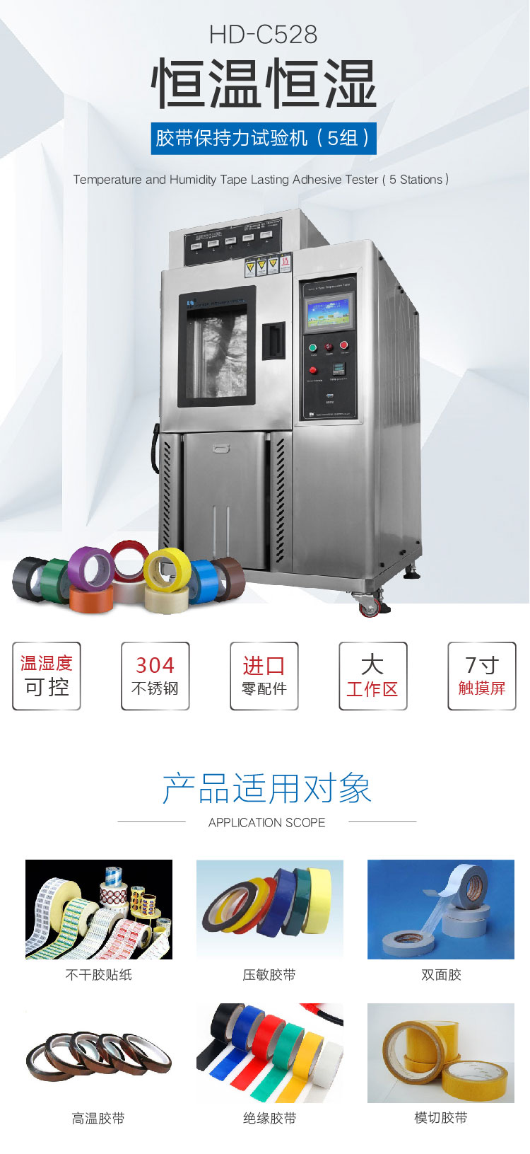 恒溫恒濕膠帶保持力試驗機主要用于測試試樣的抗粘連性,測試壓敏膠帶持粘性,靜態(tài)負荷試驗。將膠帶粘于試驗板上, 下端懸掛標準荷重,經一段時間自動計時后, 測量膠帶下滑距離或膠帶粘著時間用來評定膠帶粘著的持久性。