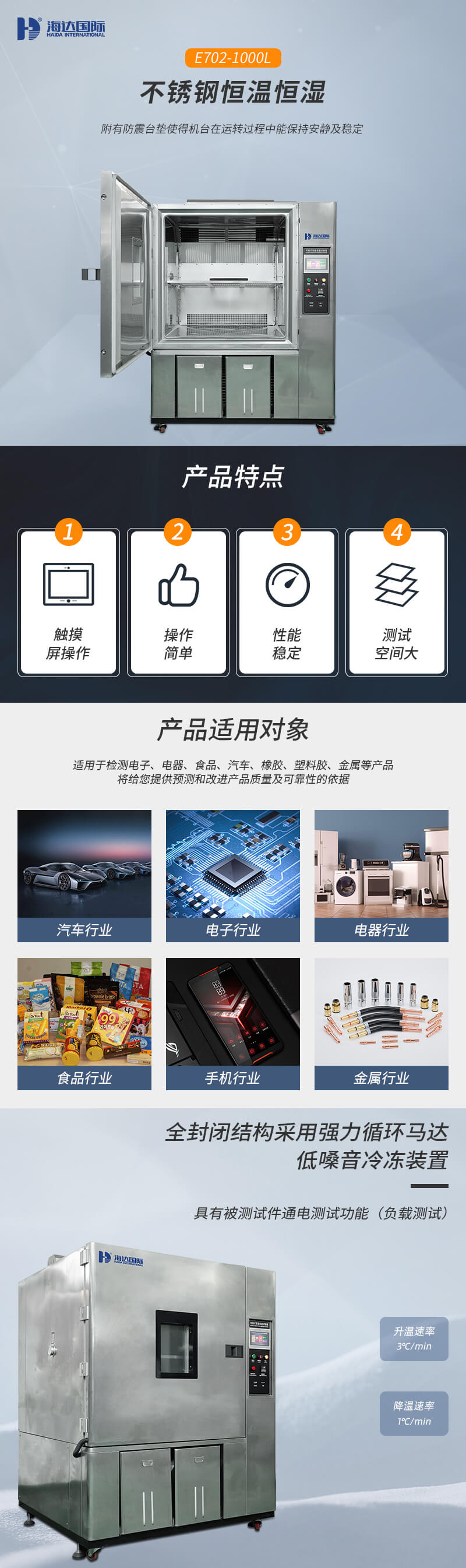 該系列不銹鋼款交變濕熱試驗箱,主要用于模擬新型材料、電工、車輛、金屬、電子產(chǎn)品等在運輸、儲存、使用過程中可能會遇到的嚴(yán)酷高溫、低溫或濕熱環(huán)境;或高溫、低溫、濕熱交變環(huán)境。