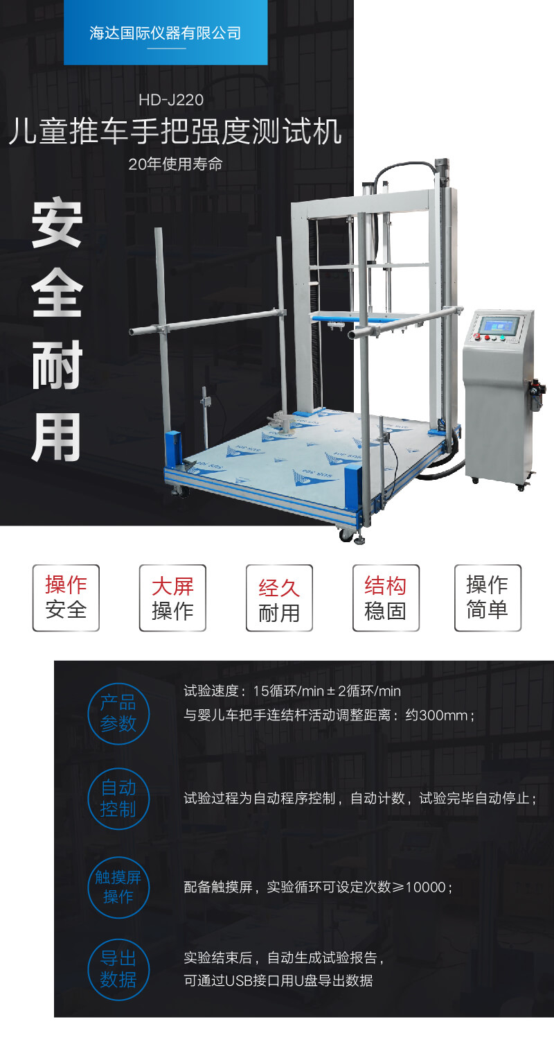 兒童推車手把強度測試儀適用于檢測兒童推車手把強度,模擬兒童推車手把多次使用后其結構件的完整性和功能是否缺失。