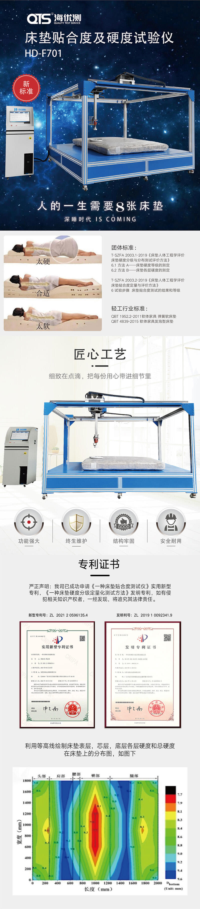 床墊貼合度綜合試驗機用于對家庭、酒店、旅館、飯店等場合使用的彈簧軟床墊和發(fā)泡型床墊進行出廠成品檢測,對床墊硬度和滯后損失率及貼合度進行測試,測試完成后根據(jù)測試評定試樣的等級。