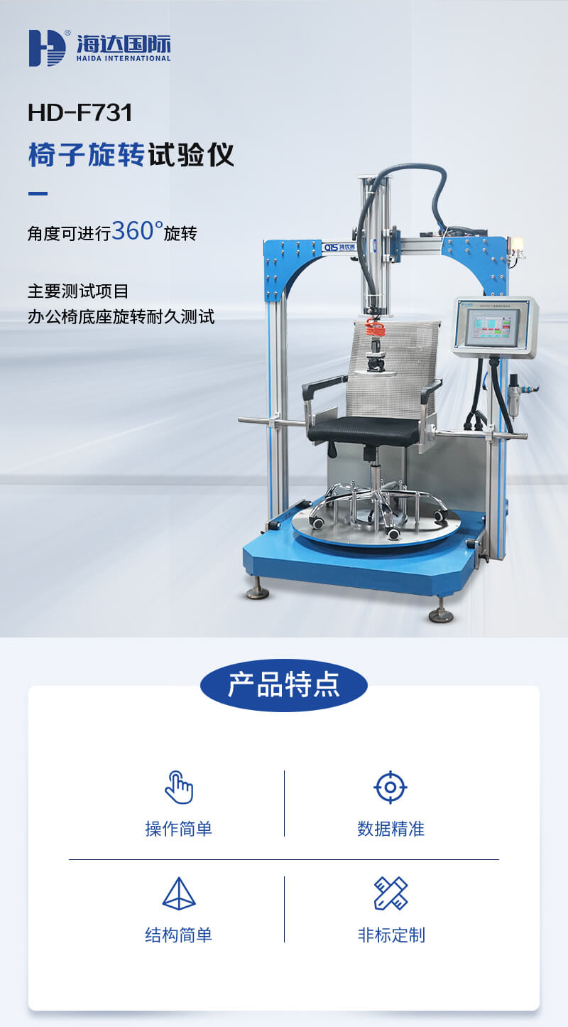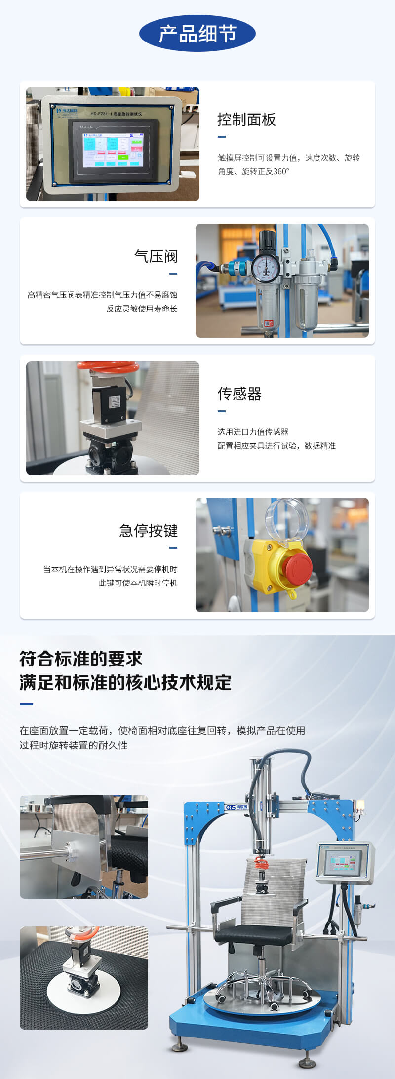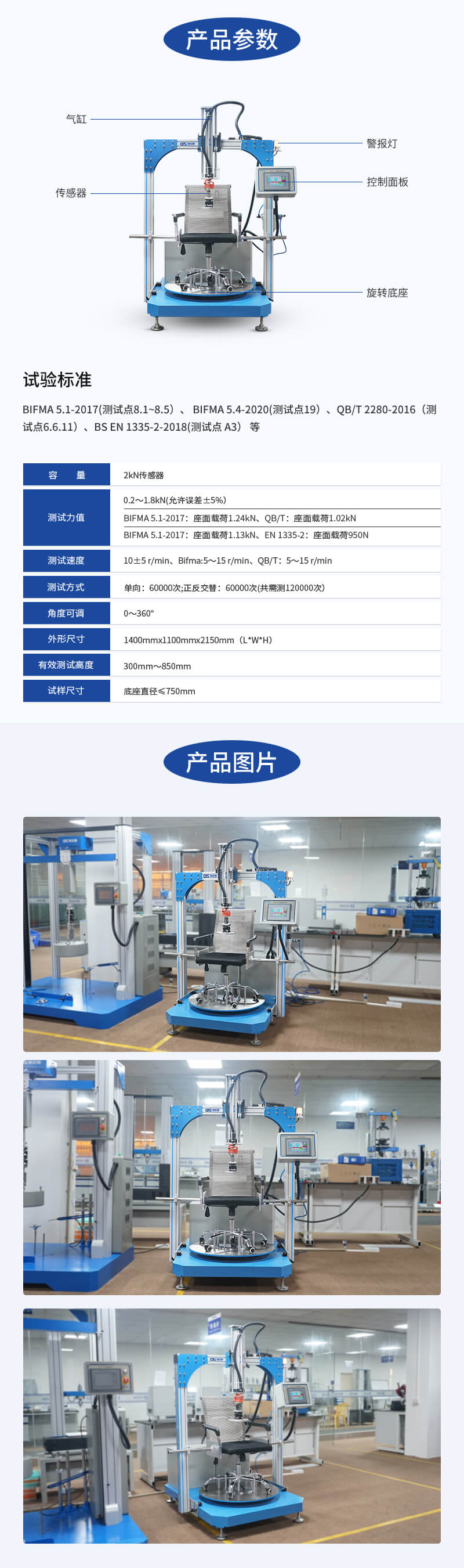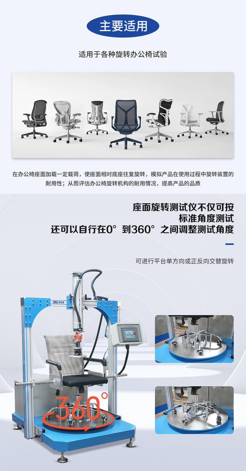 椅子旋轉試驗機適用于辦公椅重復旋轉試驗,在辦公椅座面加載一定載荷,使座面相對底座往復旋轉,模擬產品在使用過程中旋轉裝置的耐用性;從而評估辦公椅旋轉機構的耐用情況,提高產品的品質。