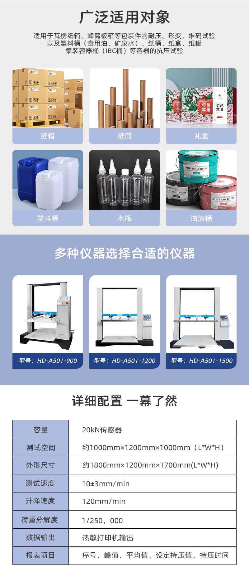 該儀器是專業(yè)用于測試紙箱抗壓性能的試驗(yàn)機(jī),適用于瓦楞紙箱、蜂窩板箱等包裝件的耐壓、形變、堆碼試驗(yàn),以及塑料桶(食用油、礦泉水)、紙桶、紙盒、紙罐、集裝容器桶(IBC桶)等容器的抗壓試驗(yàn)。