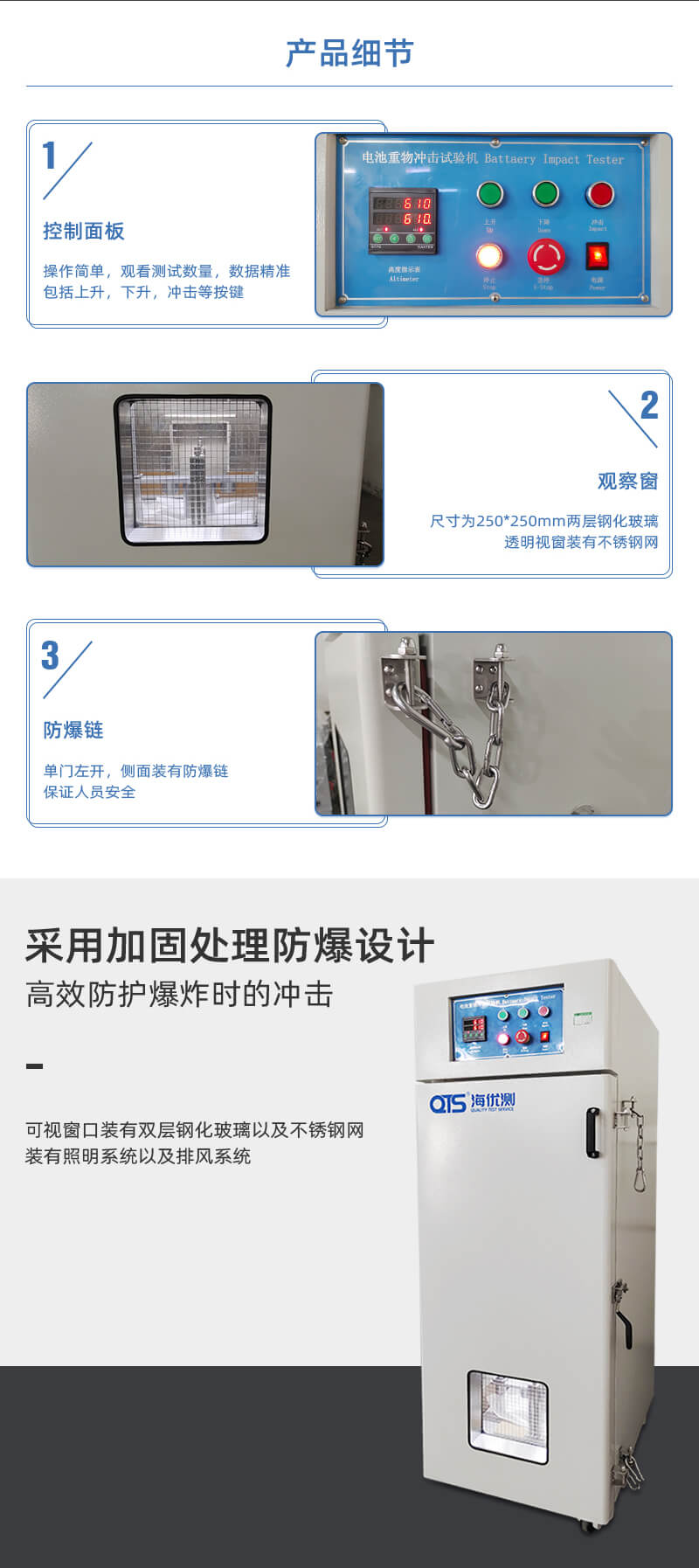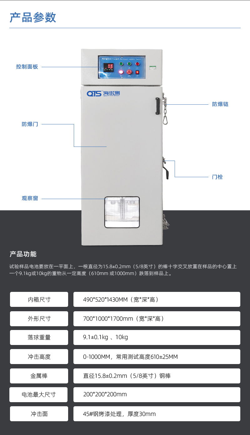 試驗樣品電池要放在一平面上,重物從一定高度(610mm 或1000mm)跌落到樣品上。圓柱形或方形電池在接受沖擊試驗時,電池的最長軸垂直于鋼柱,最大面垂直于沖擊方向,每只電池只接受一次沖擊試驗。電池不起火,不爆炸為合格。