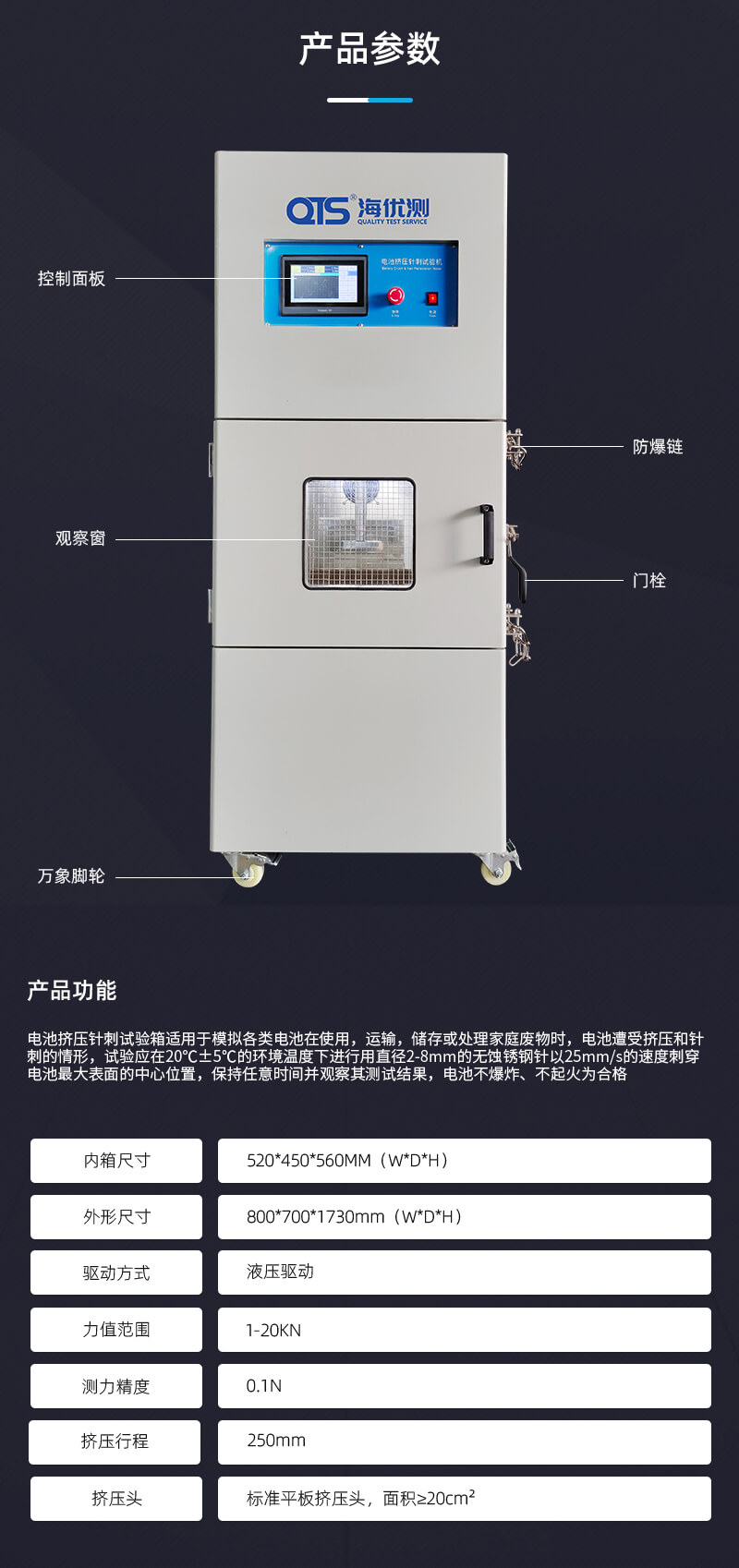 HD-H212電池擠壓針刺試驗箱適用于模擬各類電池在使用,運輸,儲存或處理家庭廢物時,電池遭受擠壓和針刺的情形,用直徑2-8mm的無蝕銹鋼針以25mm/s的速度刺穿電池最大表面的中心位置,保持任意時間并觀察其測試結(jié)果,電池不爆炸、不起火為合格。